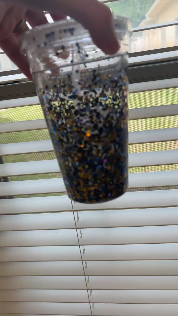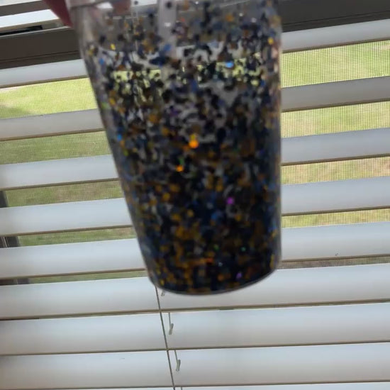 The 16oz plastic tumbler comes with a lid and straw. Any color glitter is available. ( slow flow )